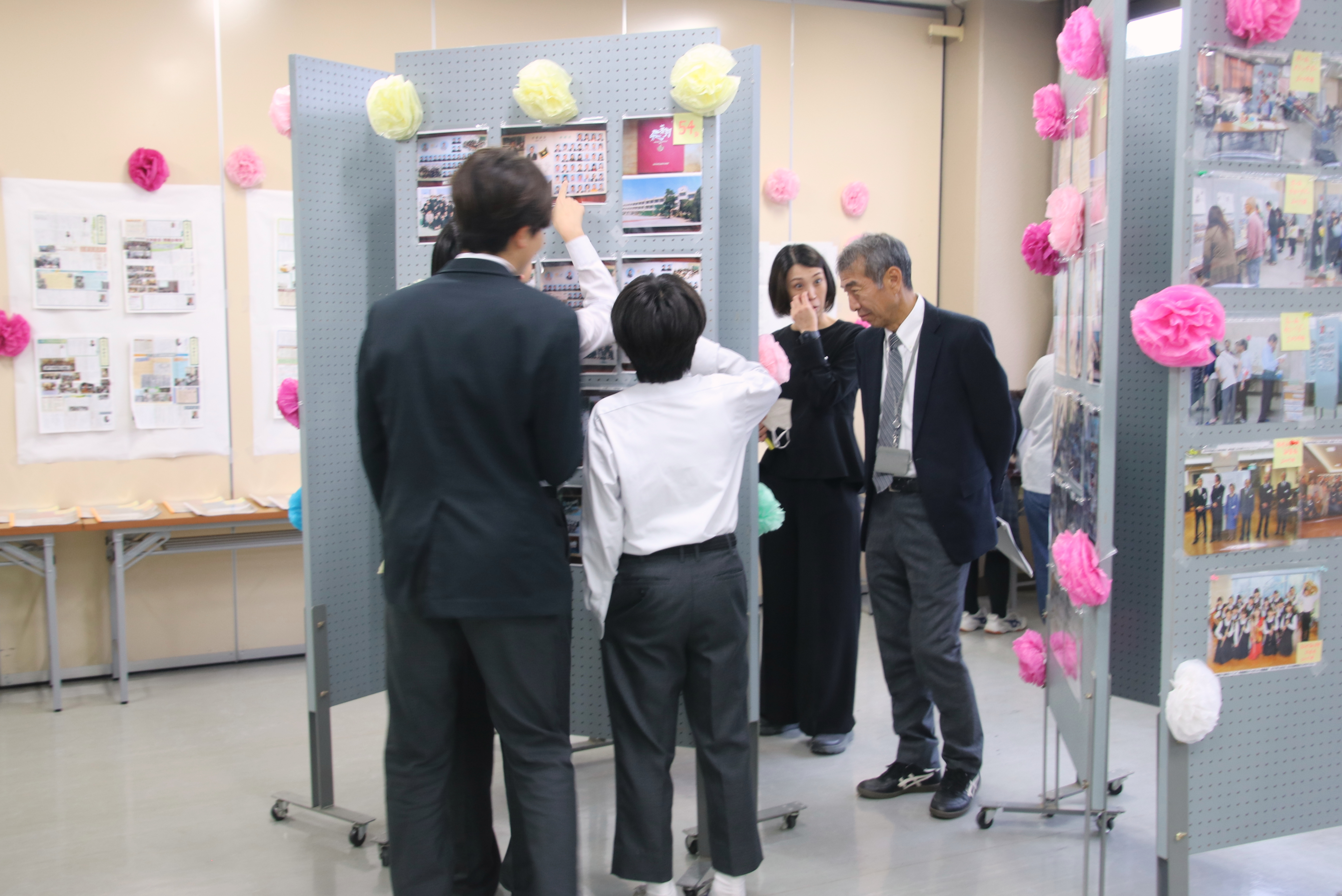 同窓会会長(一番右)も来訪者に熱心に説明しています