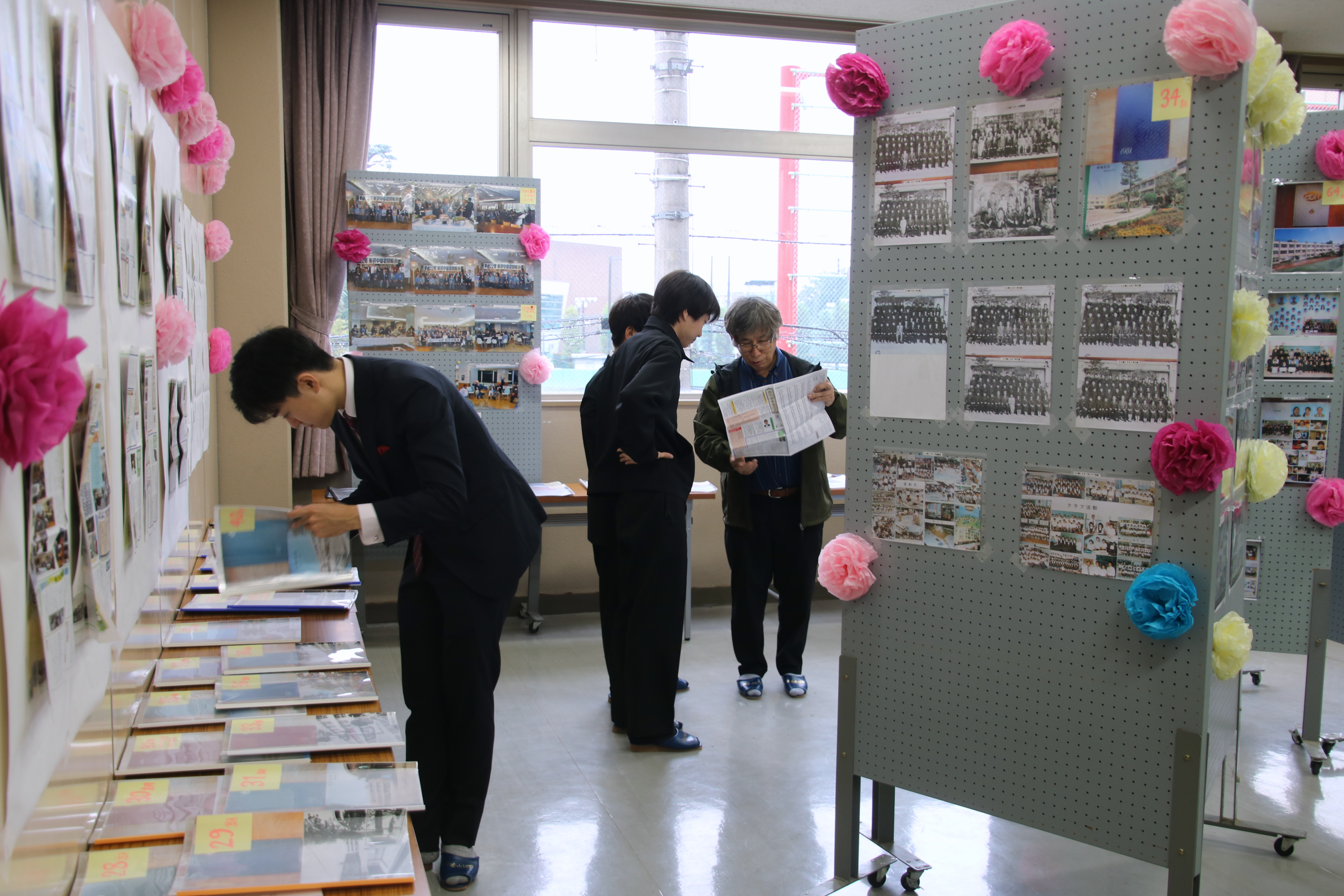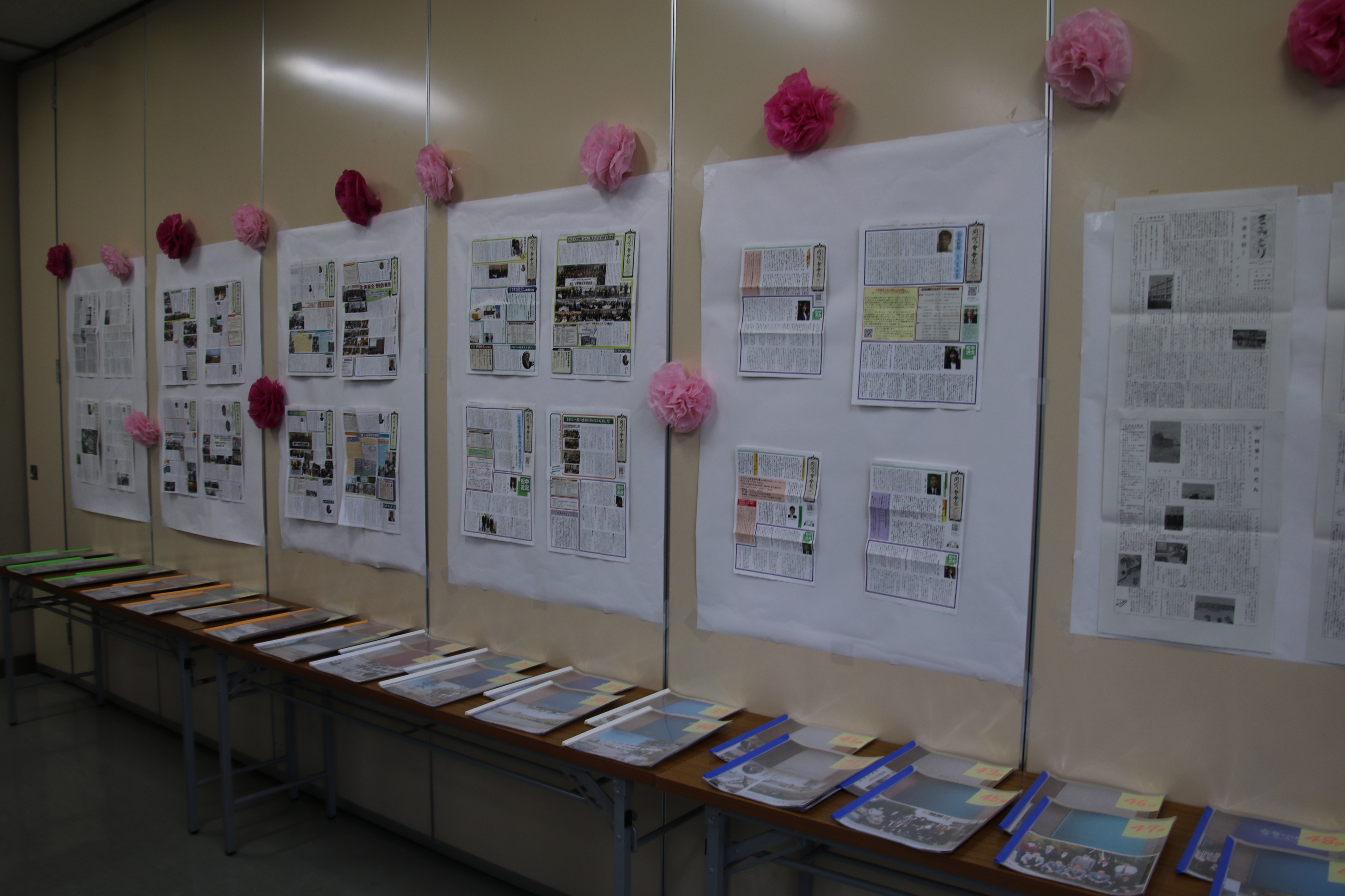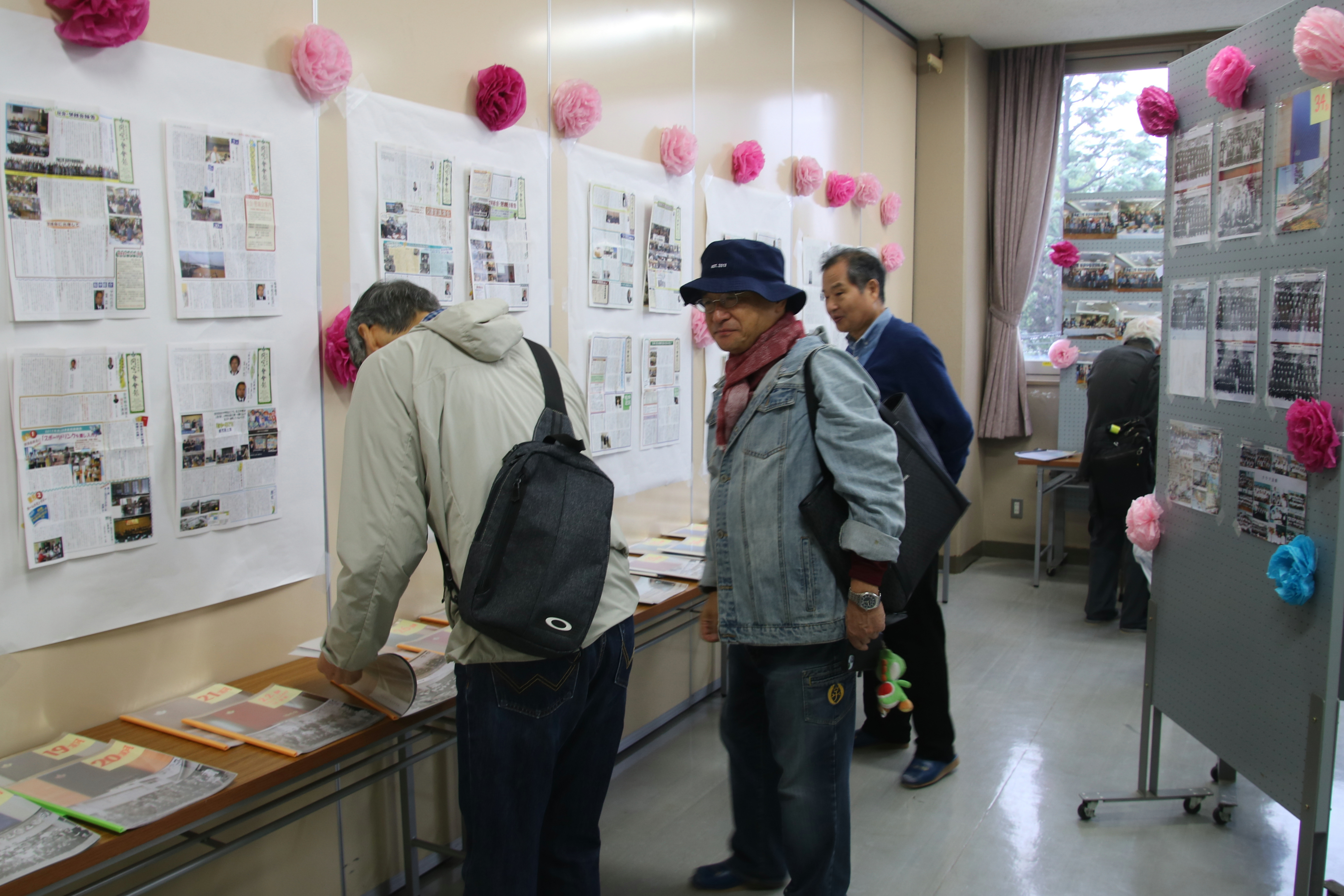 すべての期の卒業アルバムの一部と過去の会報紙等を配置して、スタッフが説明しました