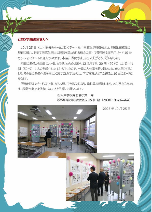 2024年10月19(土)にホームカミングデーを松沢中学校ミーティングルームで9:00~14:00開催しました。
